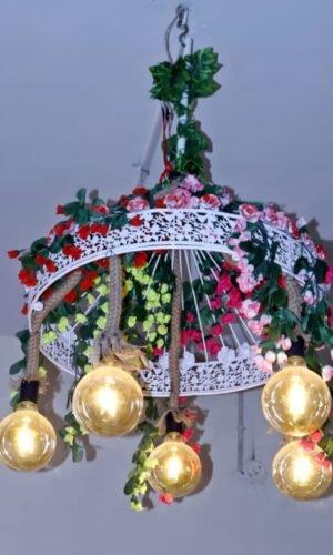 The chandelier has a delicate and feminine appearance, thanks to its lace-like pattern and artificial flowers. The soft lighting provided by the five light bulbs adds to its warm and inviting ambiance. The chandelier’s design suggests that it is intended for decorative purposes, rather than functional lighting alone. It could be used in a variety of settings, such as a living room, dining room, or bedroom, to add a touch of elegance and sophistication.