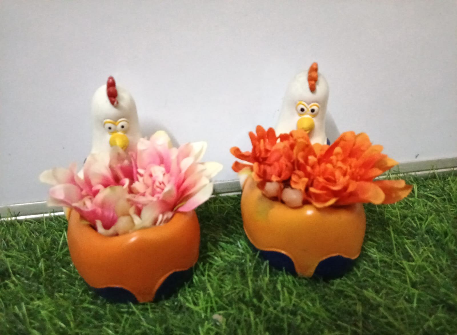 Set of two novelty resin planters designed as humorous chickens “sitting” in bright orange pots. Features an expressive white chicken head and body atop a vibrant base. Perfect for holding small plants, succulents, or office supplies; suitable for both indoor and outdoor whimsical decor.