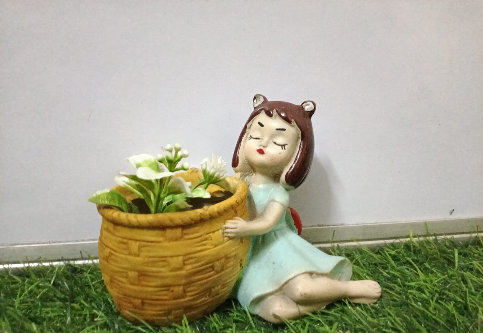 Charming resin figurine featuring a serene girl in a blue dress reclining next to a textured, woven basket that serves as a planter. Ideal for small succulents, artificial flowers, or as a sweet accent for fairy gardens, desks, and shelves. Adds a delicate, whimsical, and peaceful touch.