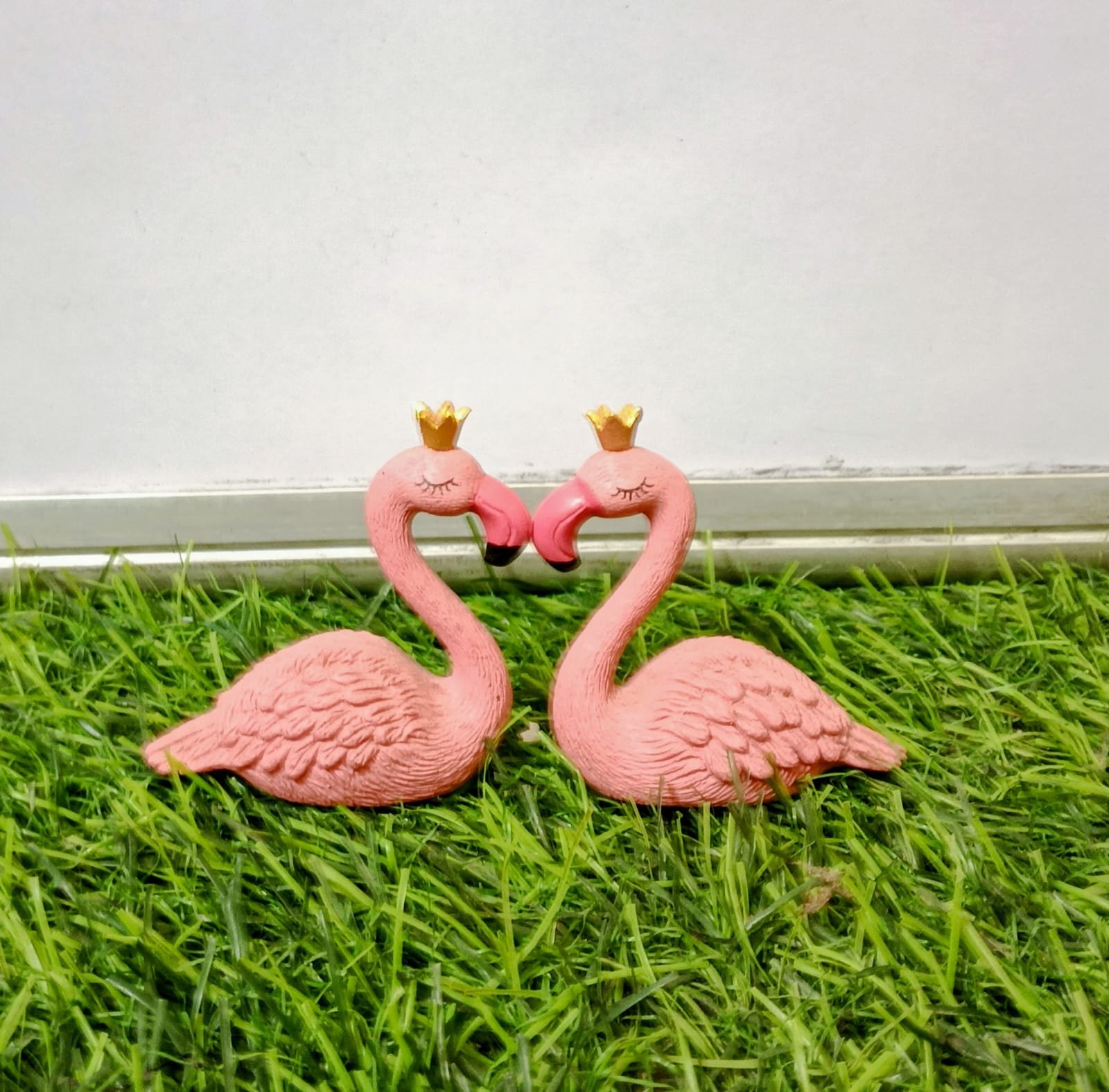 Set of two adorable coral pink resin flamingo figurines designed to form a kissing heart shape, each wearing a tiny gold crown. Perfect for adding a romantic, tropical, and whimsical touch to any desk, shelf, or miniature garden.