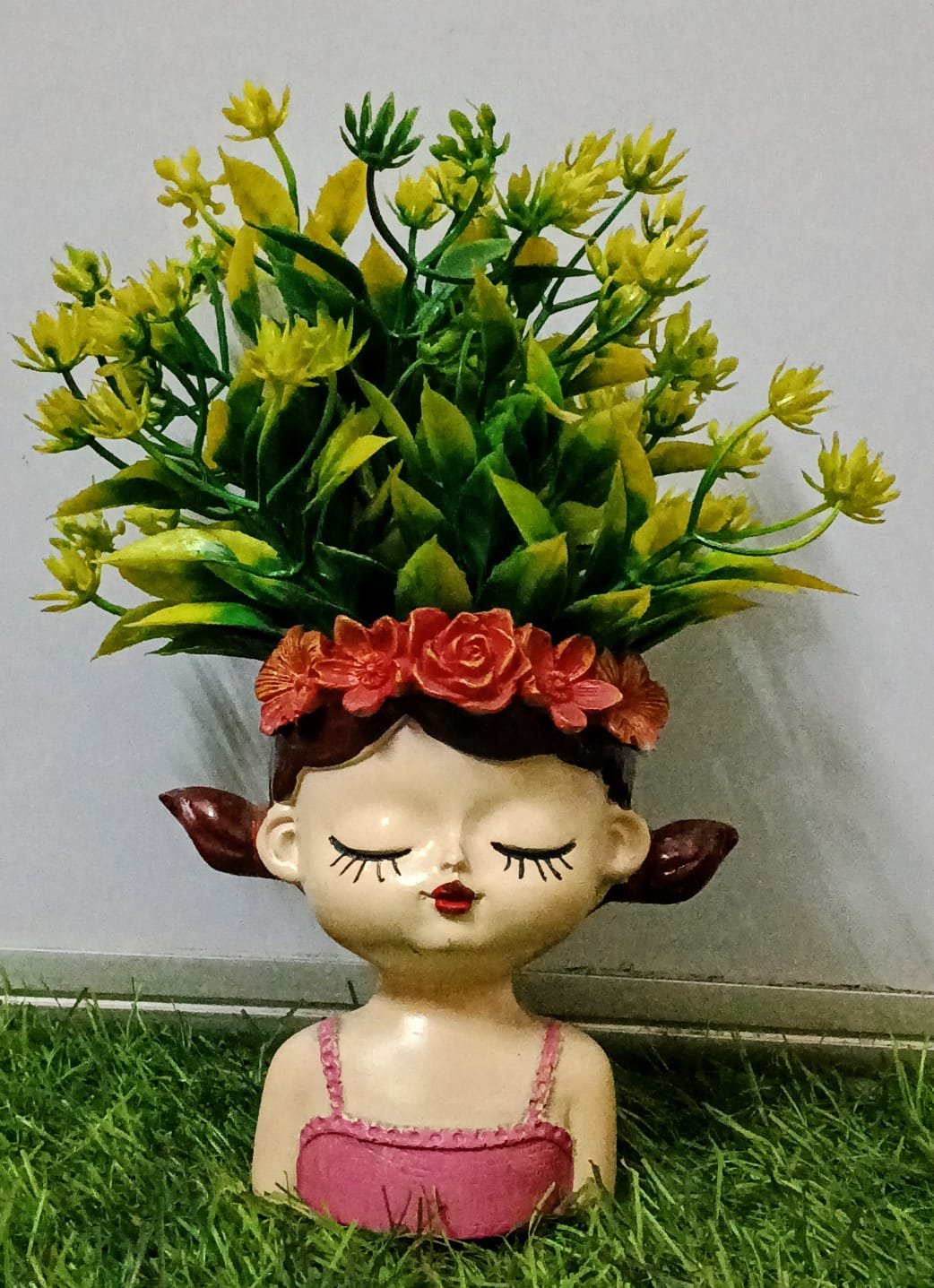 Design and Aesthetics: The planter features the head and shoulders of a girl with a gentle, dreamy expression. Her eyes are sweetly closed beneath long, sculpted lashes, and her lips are painted a soft red. Her hair is styled in two cute little pigtails, and she wears a simple pink camisole. The most striking feature is the floral crown of terracotta and red roses and blossoms adorning her head, which beautifully frames the opening of the planter.
