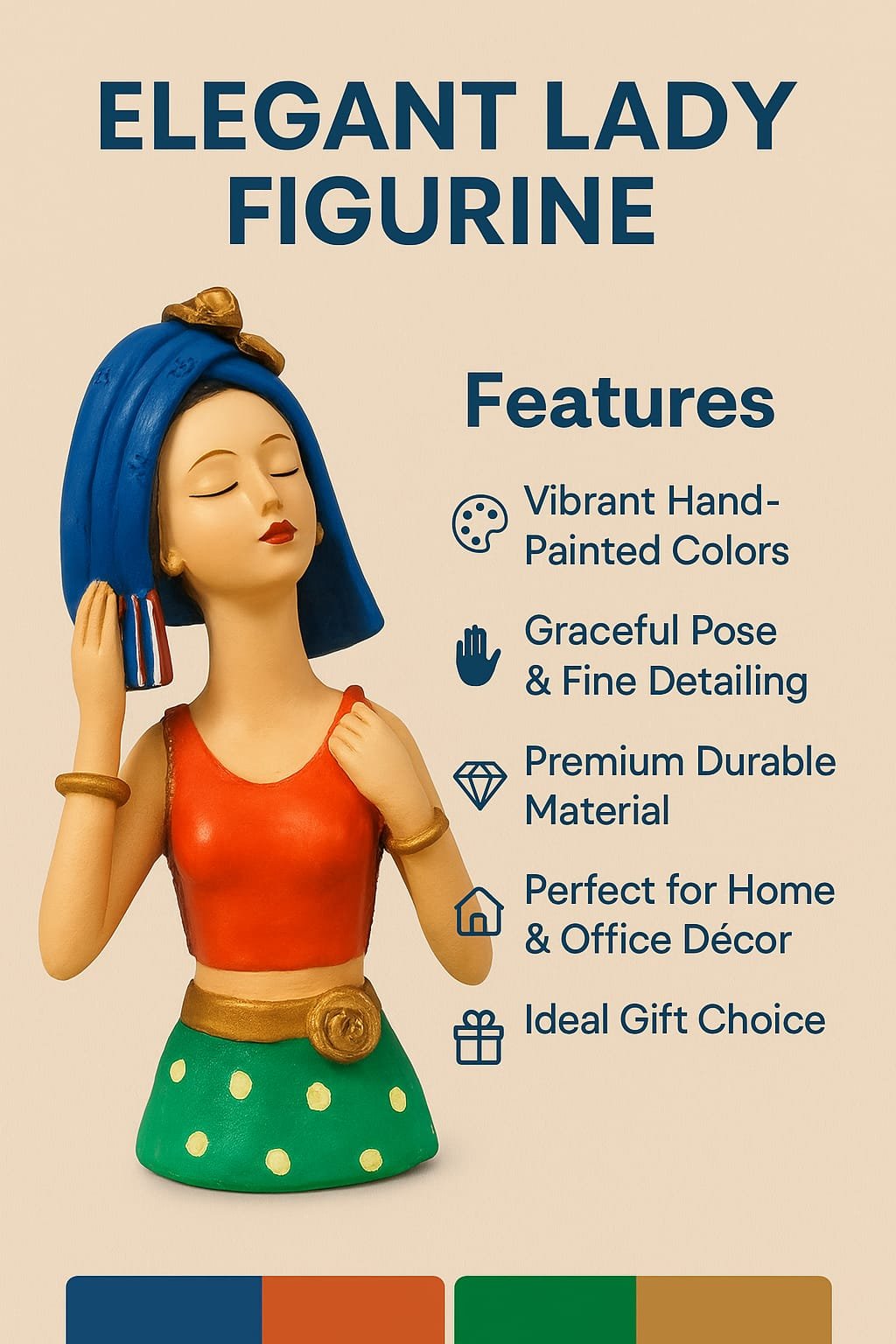 Design and Aesthetics: The figurine captures the relaxed, bohemian spirit of a fashion-forward woman enjoying a moment of quiet serenity. Her eyes are gently closed, face tilted slightly upward, evoking a sense of peaceful meditation or post-bath luxury. She is styled in a striking outfit: a bright tangerine orange top paired with a vivid teal green skirt accented with playful white polka dots and a golden rose detail at the waist. The look is crowned with a statement electric blue headwrap or turban, tied with a luxurious golden knot. This colorful palette makes the piece a true focal point, suitable for Bohemian, Eclectic, or Maximalist decor styles.
