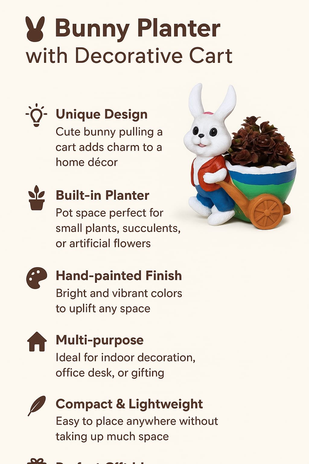 An utterly charming resin planter featuring a smiling white bunny dressed in red and blue, pushing a colorful cart that holds a flower pot. Perfect for succulents, small florals, and adding a whimsical, garden-themed touch indoors or out.