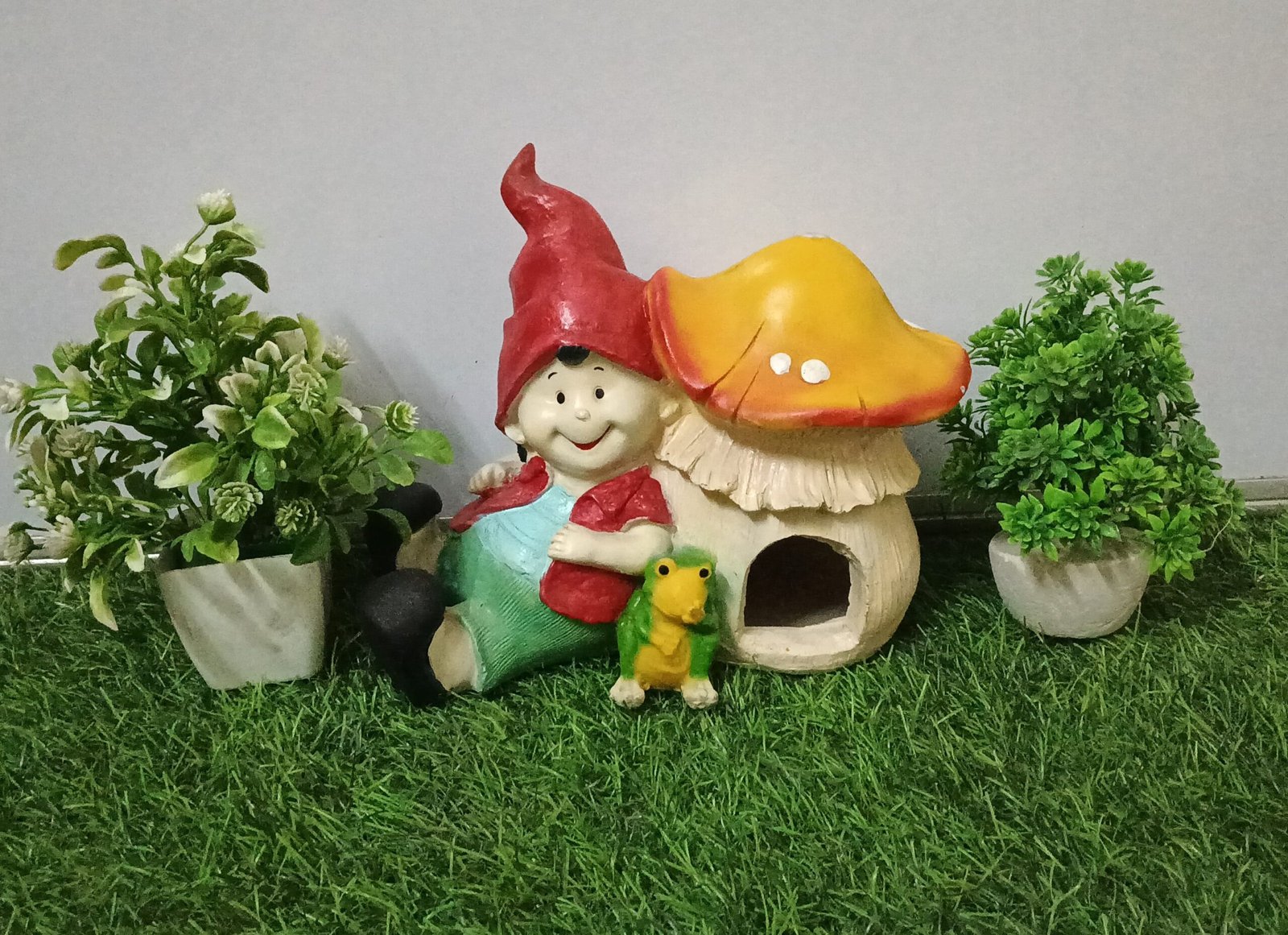 Vibrant resin flower holder featuring a serene lady in an electric blue turban, orange top, and teal polka-dot skirt. A stunning, eclectic piece for displaying faux or fresh florals.